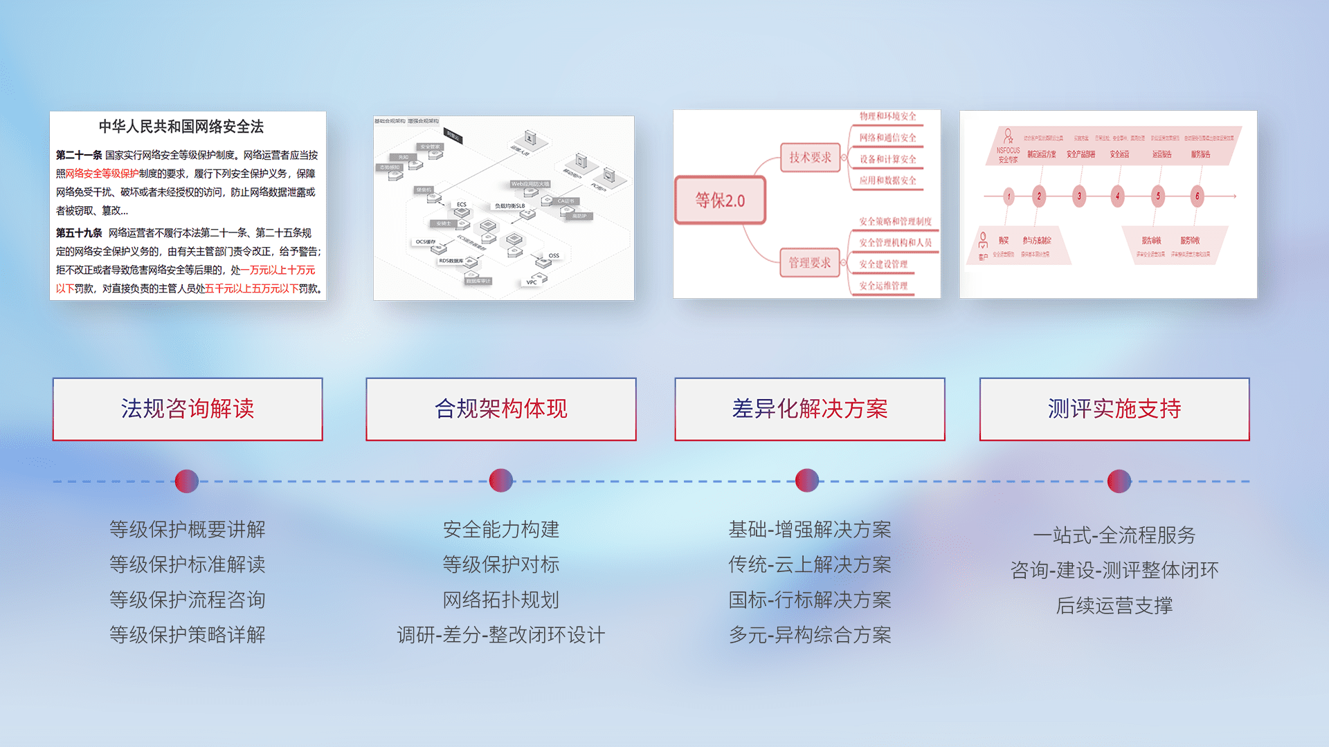 通过专业的法律咨询解读、、合规架构体现、、、、差异化解决方案、、、、测试实施支持等服务,,为客户量身打造等保合规体系。。。